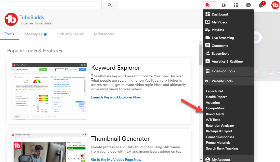 Another cool feature of TubeBuddy is its Brand Alerts. It will assist you to know when someone mentions your brand (your channel name).