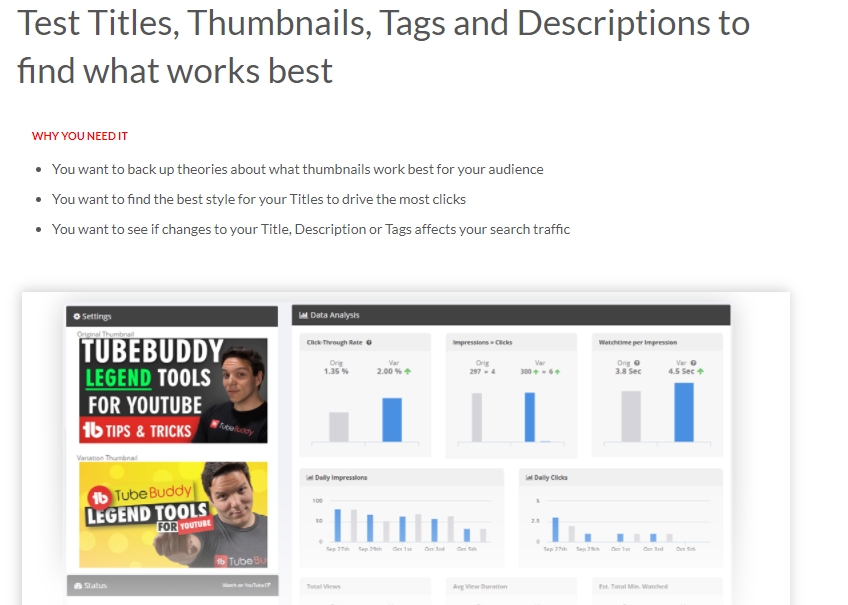 A/B Testing should be one of the most prevailing features of TubeBuddy. It helps you to test and understand which thumbnail, tags, keywords, and the title is best for your videos.